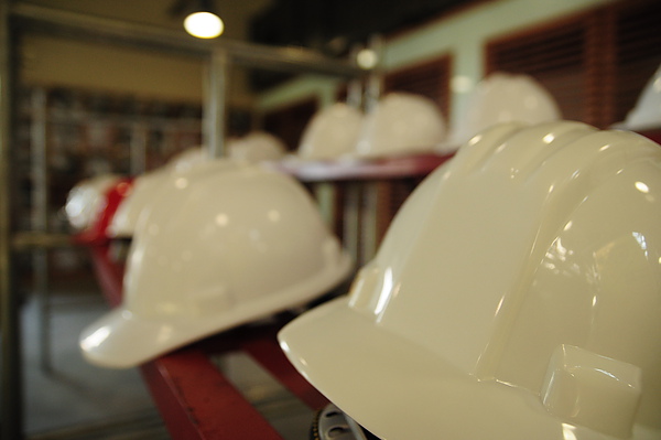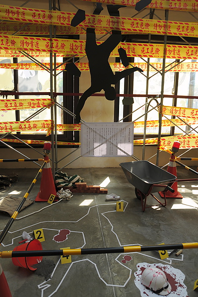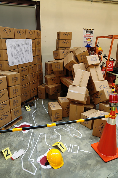 這張是敘述一旁工作的山貓在倒退時撞倒堆積貨物而壓死一旁的工人,該名工人表示:躺著也中槍...