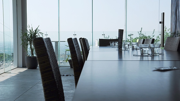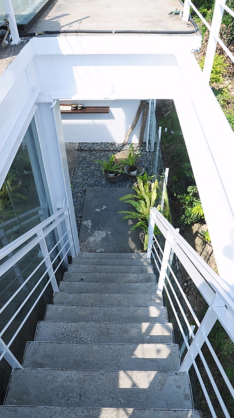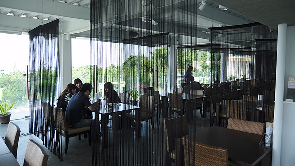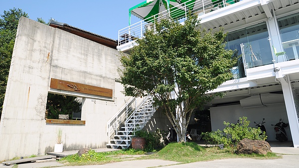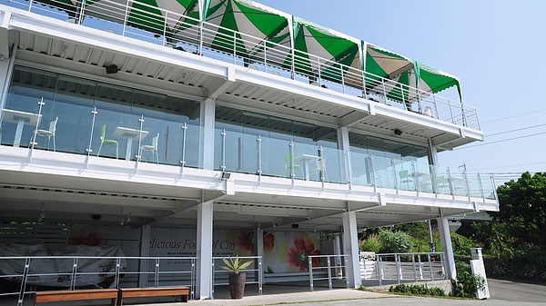 位於山坡上以白色為主體的三層樓建築物,一樓停車場,二、三樓為用餐的地方
