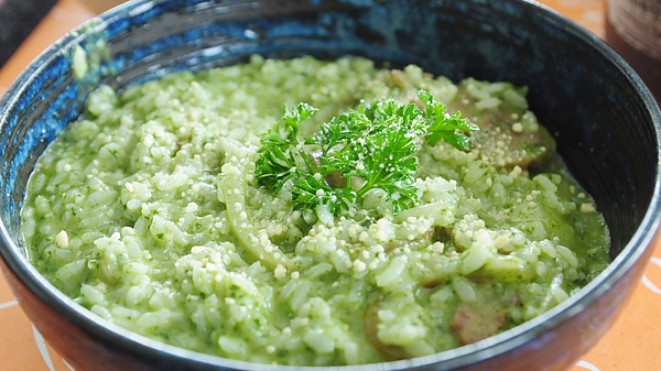 看起來不是很討喜的羅勒青醬培根燉飯,不過味道很濃郁,好吃