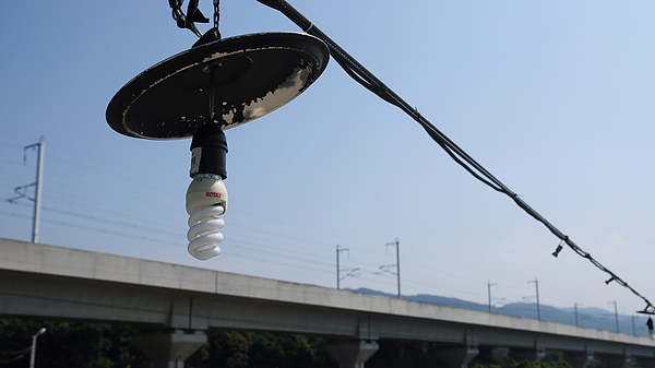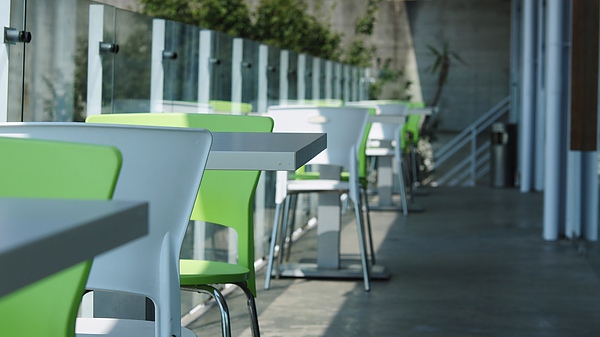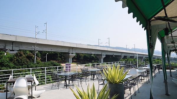 空蕩蕩的三樓,沒人想在正中午曬太陽用餐,旁邊就是高鐵